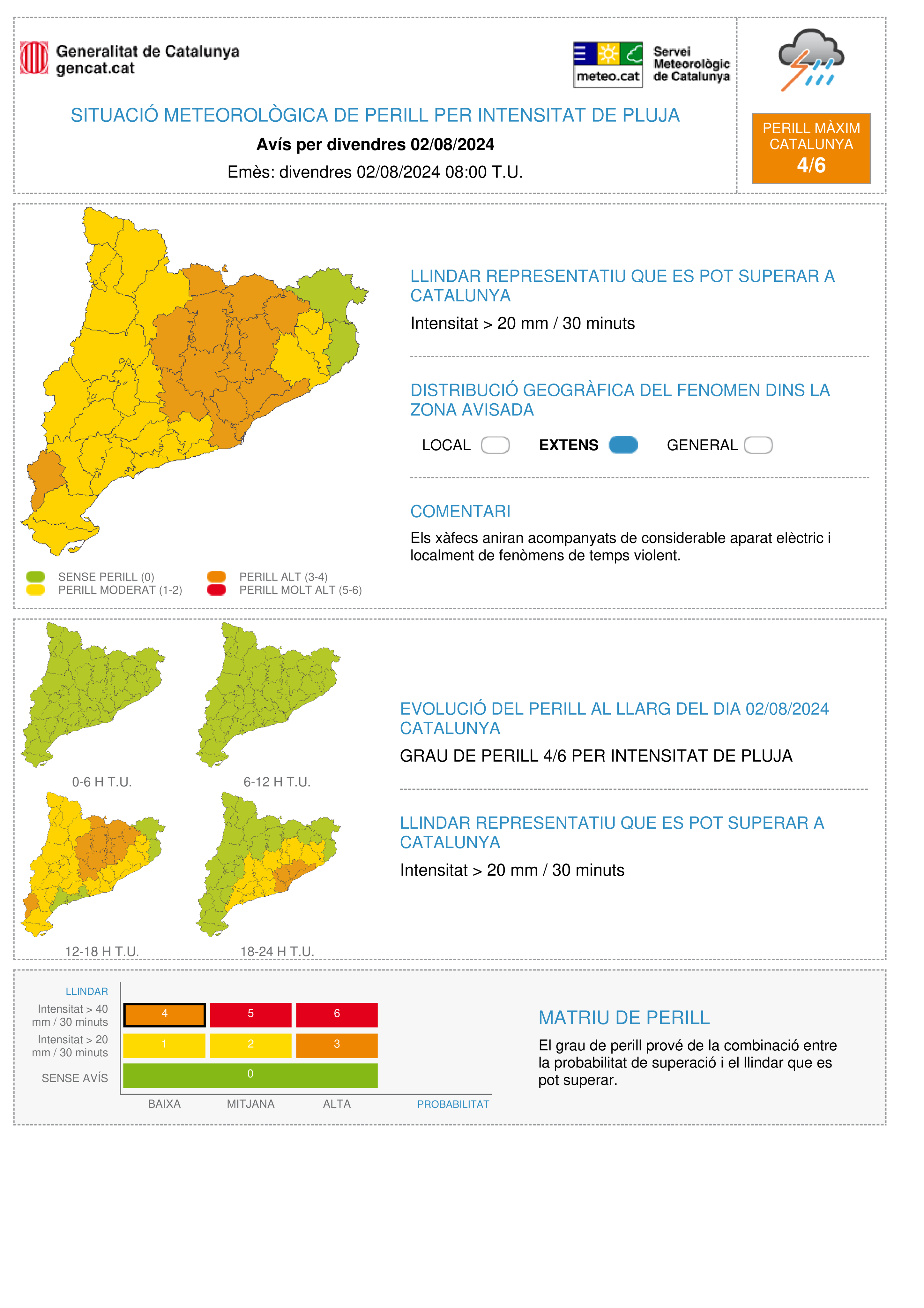 En totes aquestes zones hi ha un perill de 4 sobre 6 de produir-se xàfecs amb considerable aparat elèctric i que puguin anar acompanyats de fenòmens de temps violent, com ara calamarsa i fortes ràfegues de vent. Allà on plogui, les tempestes poden deixar fins a 20 l/m² en 30 minuts, i quantitats fins i tot superiors de forma local, fins a arribar als 40 l/m² en 30 minuts.
