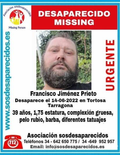 L'Associació SOS Desapareguts sol·licita la col·laboració ciutadana per a trobar a Francisco Jiménez Prieto, un home de 39 anys de Barcelona que va desaparèixer el passat 14 de juny a Tortosa, província de Tarragona. Els seus familiars i amics no tenen notícies d'ell des de fa sis dies.
