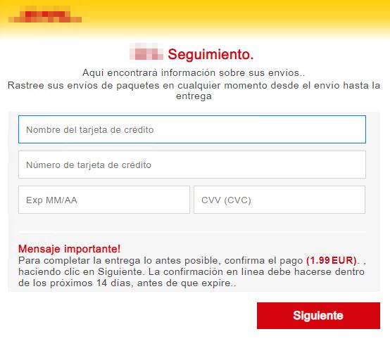 En la següent imatge es mostrarà un exemple d'una web clonada per un ciberdelinqüent, és a dir, una web imitant a la pàgina real d'un servei de missatgeria i repartiment.