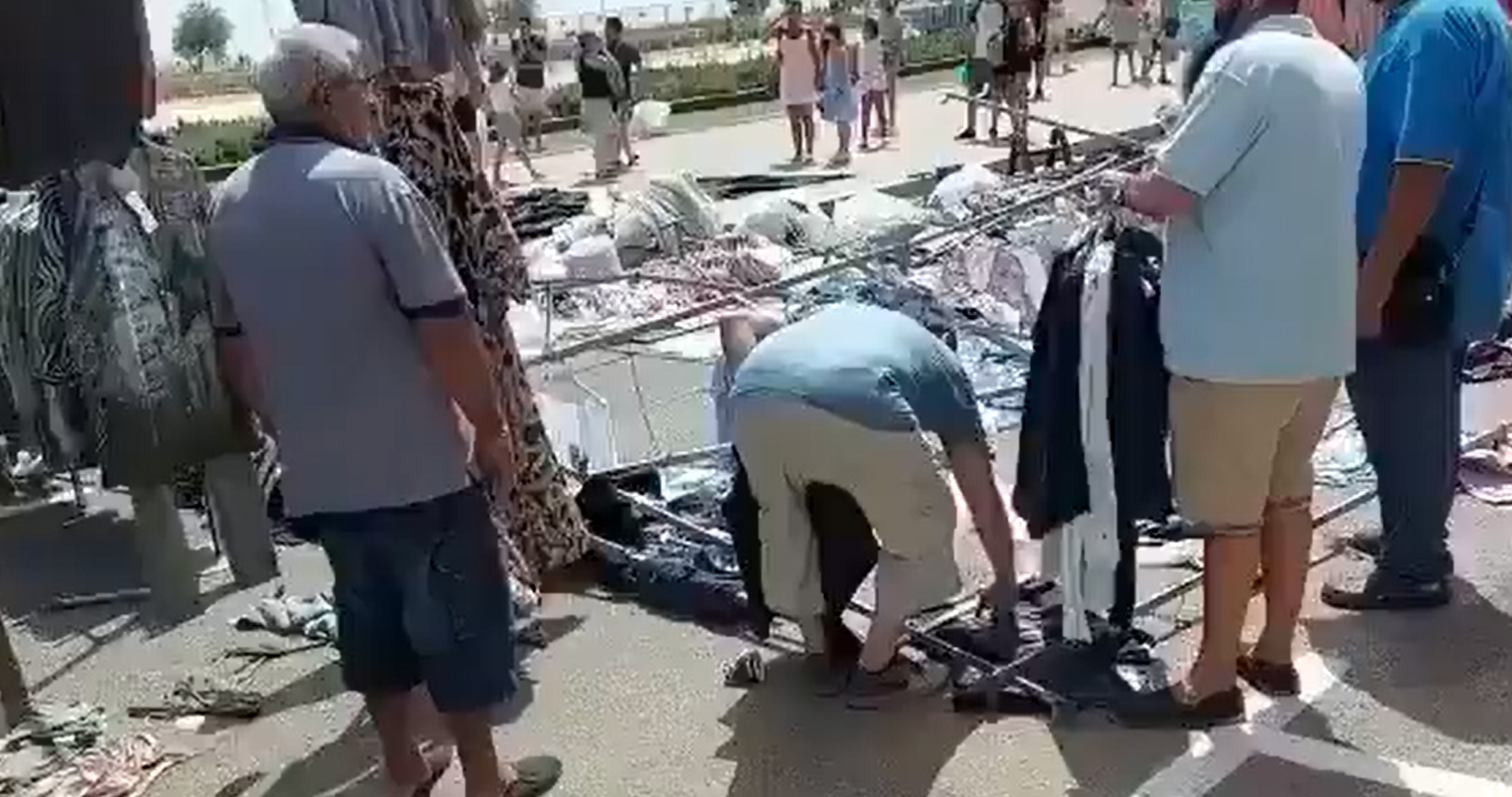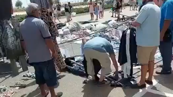 El fort vent provocat per l'helicòpter va desmuntar i tirar per terra una de les parades del mercat.