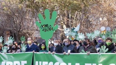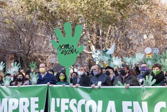 Les entitats agrupades en la plataforma Som Escola i els sindicats estan en primera línia de la capçalera, incloent Javier Pacheco i Camil Ros, i els partits van en segona línia. A més de senyeres i estelades, els manifestants porten cartolines verdes en forma de mà.