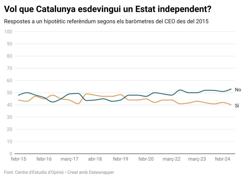 El 'no' en un potencial referèndum s'ha imposat al 'sí' en tots els baròmetres des de fa cinc anys, amb una distància que mai havia superat els 11 punts fins ara i sempre movent-se entre el 47% i el 52% des del 2019. En canvi, el 'sí' havia estat l'opció majoritària en alguns baròmetres en els quatre anys anteriors, arribant l'octubre del 2017 al 49%, però des de fa cinc anys no passa del 45%.