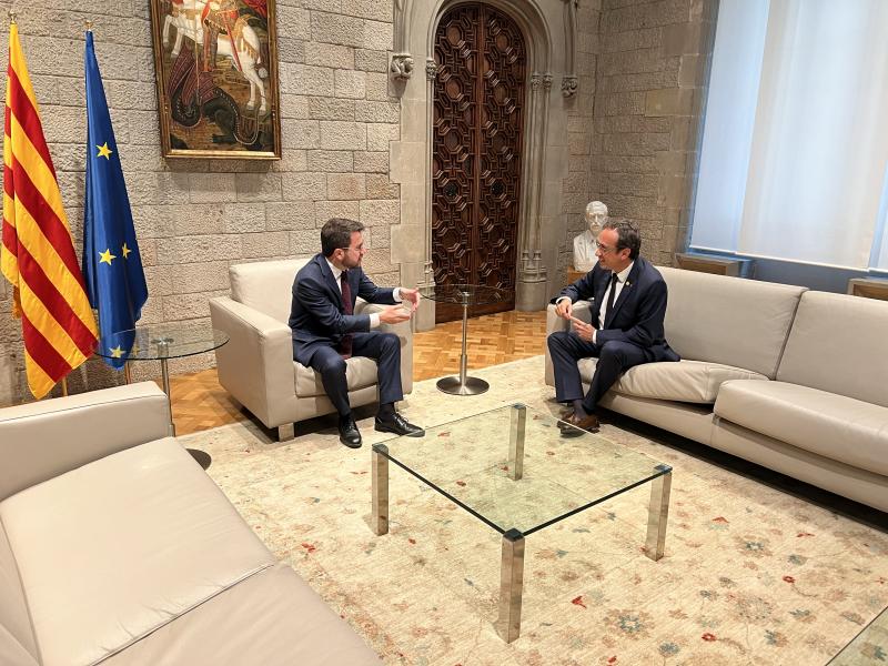 El presidente de la Generalitat en funciones, Pere Aragonès, y el presidente del Parlament, Josep Rull, se ha reunido este jueves por la mañana en el Palau de la Generalitat, en el primer encuentro institucional después de que Rull fuera elegido el pasado 10 de junio.
