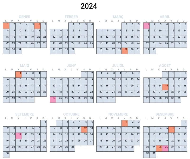 El calendario laboral de este nuevo año 2024 consta de 15 festivos: se comparten 9 nacionales, 13 en Cataluña en total, más 2 locales. El día 8 de diciembre (la Purísima) cae en domingo.