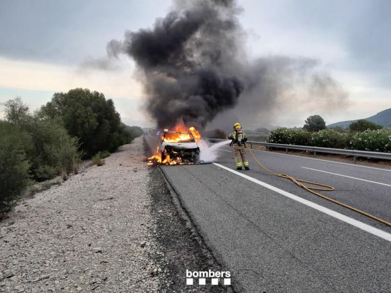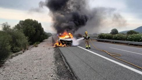 Los bomberos de la Generalitat de Cataluña trabajan en el incendio de un vehículo en la autopista AP-7 a la altura de Solivella, en El Montsià.