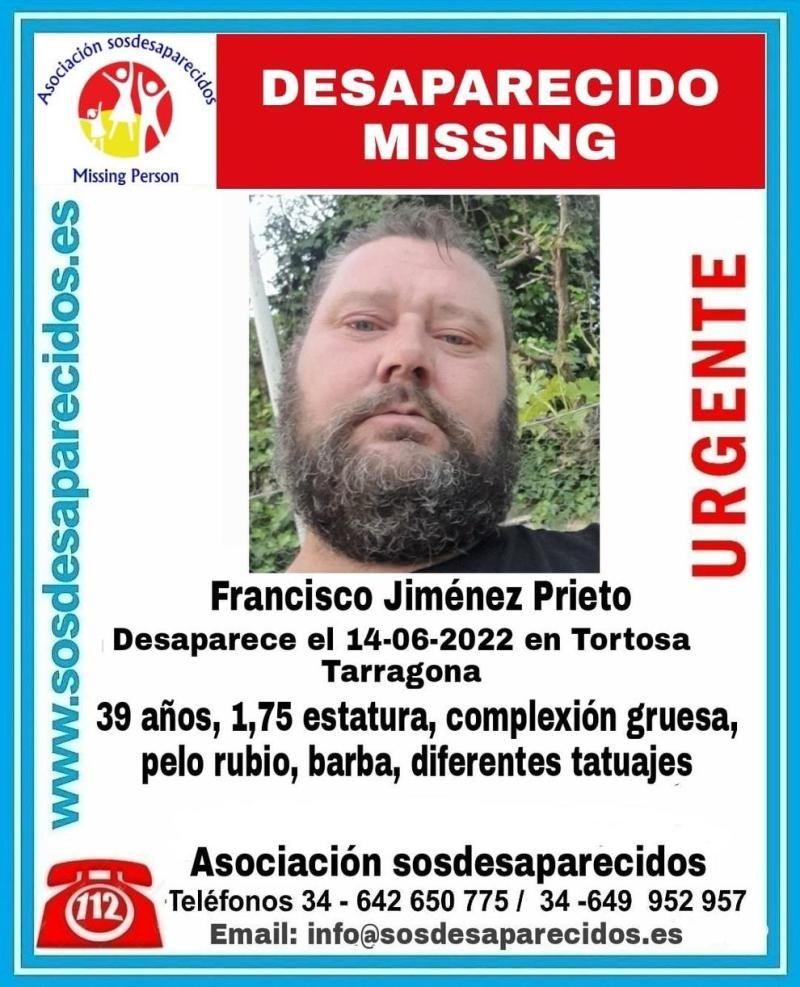 La Asociación SOS Desaparecidos solicita la colaboración ciudadana para encontrar a Francisco Jiménez Prieto, un hombre de 39 años de Barcelona que desapareció el pasado 14 de junio en Tortosa, provincia de Tarragona. Sus familiares y amigos no tienen noticias de él desde hace seis días.