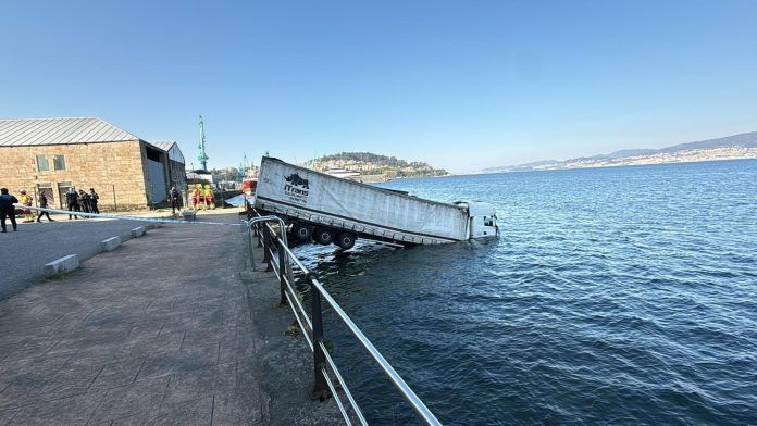 El conductor de un camión ha salido ileso después de quedarse sin frenos en Vigo, perder el control del vehículo y acabar cayendo al mar en la zona de Teis.