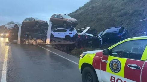 Un camión de transporte que llevaba en su remolque varios vehículos nuevos ha tenido durante la mañana de este jueves un accidente cuando circulaba por la carretera A-384 de Olvera (Cádiz). El vehículo se ha salido de la vía en el kilómetro 58, teniendo que acudir efectivos de Bomberos y de la Guardia Civil.