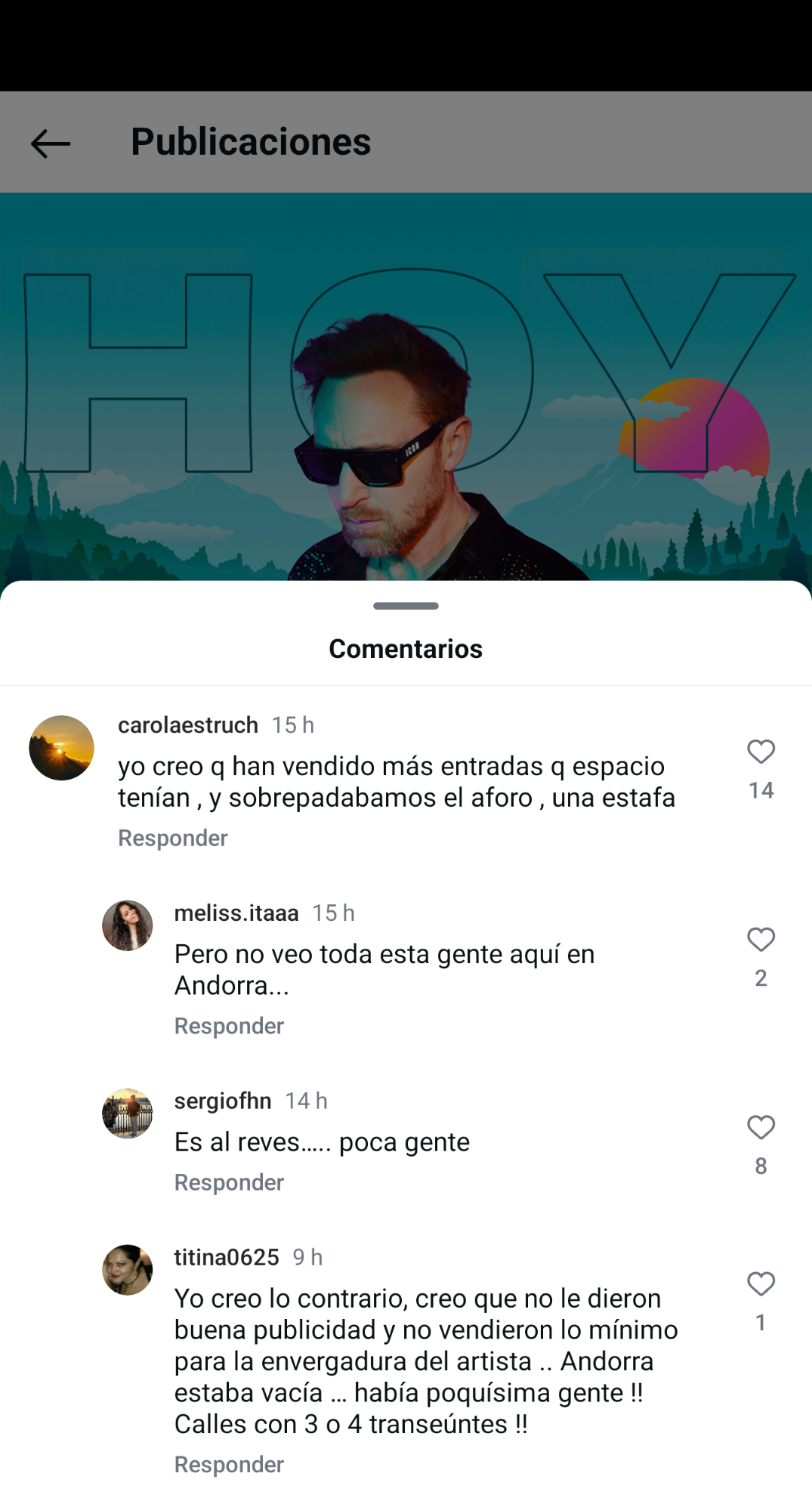 El malestar de todos aquellos asistentes se ha trasladado a las redes sociales. Según apuntan algunos usuarios, por la actuación de David Guetta se esperaba una asistencia de unas 10.000 personas y al parecer solo se habrían vendido unas 2.000 entradas a pesar de la gran campaña de promoción realizada por Andorra Turismo en Barcelona y en Madrid. Ante esta poca afluencia para ver a David Guetta, habría sido la propia organización del festival conjuntamente con el DJ quien habría decidido no actuar y cancelarlo. En todo caso, se desconocen los motivos por los que el gobierno esperó a último momento para anular la actuación. Además, según parece, finalmente el DJ no habría viajado hasta Andorra, una acción que demuestra que ya estaba todo acordado.