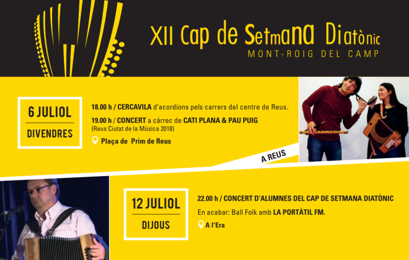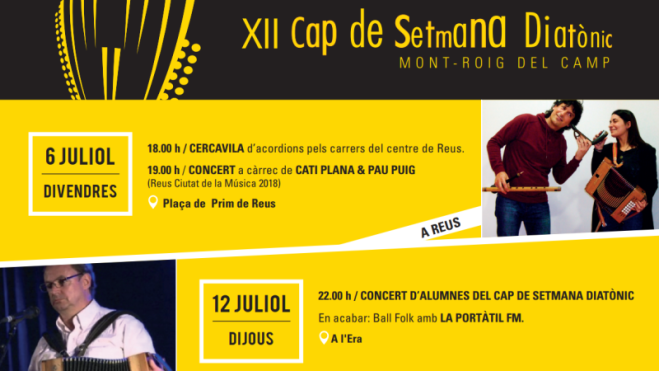 La conmemoración de Reus Ciudad de la Música 2018 ha propiciado que este viernes tenga lugar en la ciudad la primera actividad del Fin de Semana Diatónico, que tiene lugar desde hace 12 años en la población de Mont-roig del Camp. Gracias al acuerdo con la organización del certamen, este 6 de julio tendrá lugar, a partir de las 18:00 h, un pasacalle de acordeones por las calles del centro de Reus y, más tarde, a partir de las 19:00 h, se hará un concierto de Cati Plana & Pau Puig en la plaza de Prim. El XII Fin de Semana Diatónico tendrá lugar a partir del jueves 12 de julio y hasta el domingo 15 de julio en diferentes lugares de Mont-roig del Camp. Las actividades son básicamente conciertos, desde los alumnos del propio certamen, a Carles Belda y Guillem Anguera o también el grupo ¡la Fenya Rai!. Destaca como cabeza de cartel un concierto del grupo escocés Paddy Callaghan Trio, que tendrá lugar el sábado 14 de julio, a las 22:30 h, en la Ermita. Organizan el Fin de Semana Diatónico la Asociación de Vecinos Muntanya Roja de Mont-roig, Quart Minvant y Fin de Semana Diatónico, y este año han contado con la colaboración del Ayuntamiento de Mont-roig y el Ayuntamiento de Reus, con motivo de la celebración Reus Ciudad de la Música 2018, el Patronato Mare de Déu de la Roca, Vermuts Miró y Espremedora Comunicación Visual.