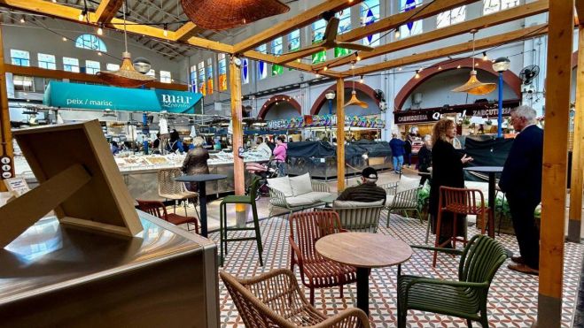 Además, el espacio cuenta con mesas y sillas para que los visitantes puedan consumir cómodamente los alimentos comprados. También se ha instalado un microondas para calentar comida o bebidas, favoreciendo así que se pueda tomar un tentempié o tomar un vermut durante la visita al mercado.