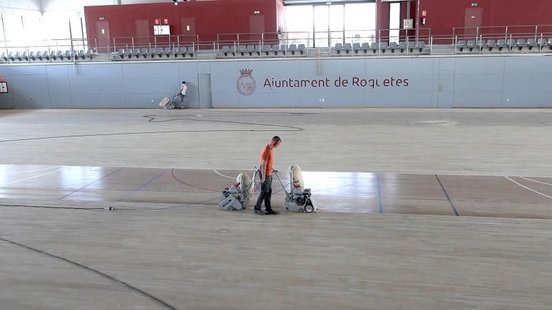 El alcalde de Roquetes, Ivan Garcia, la concejala de Deportes, Sònia Andrade y el concejal de Servicios Municipales, Jordi Allepuz, han visitado las obras de la pista polideportiva del pabellón municipal donde se está llevando a cabo el proyecto de pulido del parqué.