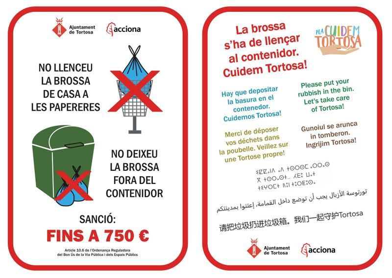 “Impulsamos una campaña de proximidad, apelamos a la corresponsabilidad de la ciudadanía para que entre todos y todas cuidemos Tortosa”, ha dicho el alcalde. Concretamente, la campaña informativa correrá a cargo de dos agentes cívicos, contratados a través del programa Trabajo y Formación, que distribuirán unos dípticos a la ciudadanía y colocarán unos adhesivos en los contenedores y papeleras con el mensaje: “No dejéis la basura fuera del contenedor” o “No tiréis la basura de casa a las papeleras”. Un mensaje que se ha editado en diferentes idiomas: catalán, castellano, inglés, francés, rumano, amazigh, chino y árabe.