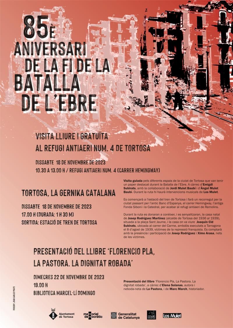 La programación del sábado también incluye la visita libre y gratuita al refugio antiaéreo número 4 de Tortosa entre las 10.30 y las 13.00 horas. Y, el día 22 de noviembre la presentación del libro 'Florencio Pla, la Pastora. La dignidad robada', en la biblioteca Marcel·lí Domingo, a las 19.00 horas.