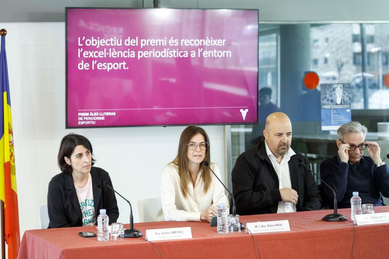 La ministra de Cultura y Deportes, Sílvia Riva, acompañada del presidente del MoraBanc Andorra, Gorka Aixàs, la directora general de RTVA, Imma Jiménez, y el director general del Diari d’Andorra, Ignasi de Planell, ha presentado este la tercera edición del Premio Àlex Lliteras de periodismo deportivo. El certamen tiene como objetivo principal reconocer la excelencia en el trabajo periodístico en torno al deporte y homenajear la figura del periodista Àlex Lliteras.