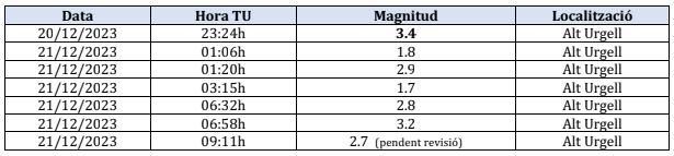 Durante las siguientes horas se han registrado más terremotos en la misma zona, alguno de magnitud similar tal como muestra la siguiente tabla elaborada por Andorra Recerca Innovació a partir de datos del Instituto Cartográfico y Geológico de Cataluña: