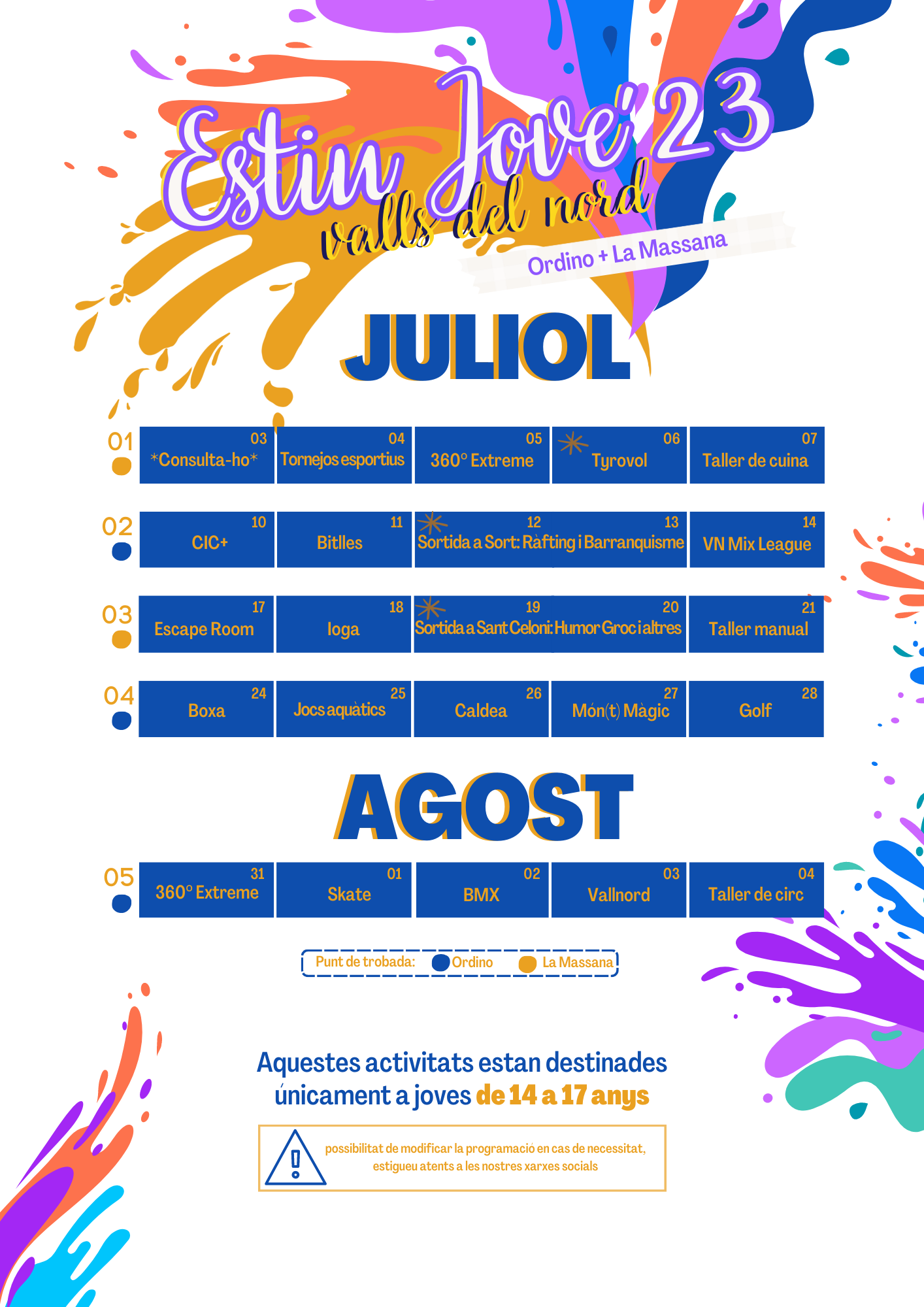 El programa incluye talleres de cocina y de circo; deportes de aventura y torneos; actividades acuáticas y excursiones y acampadas, como principal novedad. Otras actividades que se hacen por primera vez, son el boxeo o el taller de danzas urbanas. Tampoco faltarán algunas de las salidas habituales, como la del 360º Extrem y Caldea.