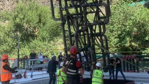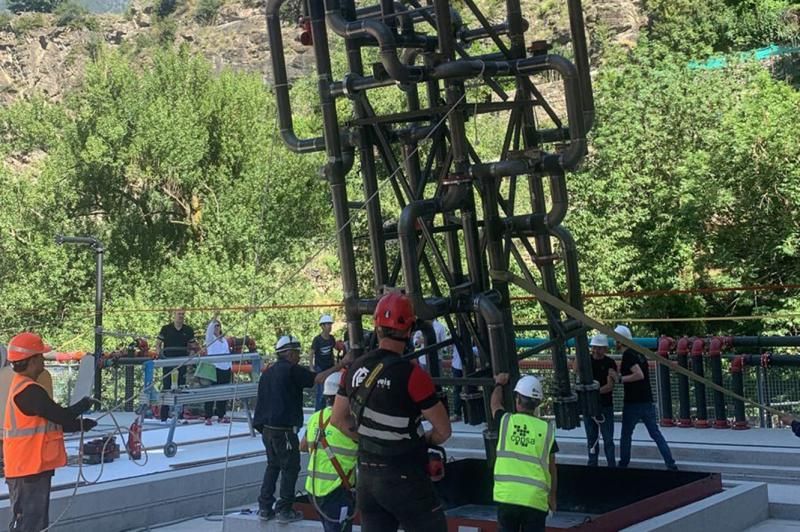 Los operarios han comenzado a instalar este miércoles por la mañana la escultura monumental del proyecto Caldes en la plazoleta del Madriu. Se trata de la estructura principal de la obra de Javier Balmaseda, a la que ahora habrá que poner toda la instalación eléctrica, los grifos y las bañeras para que raje el agua termal.