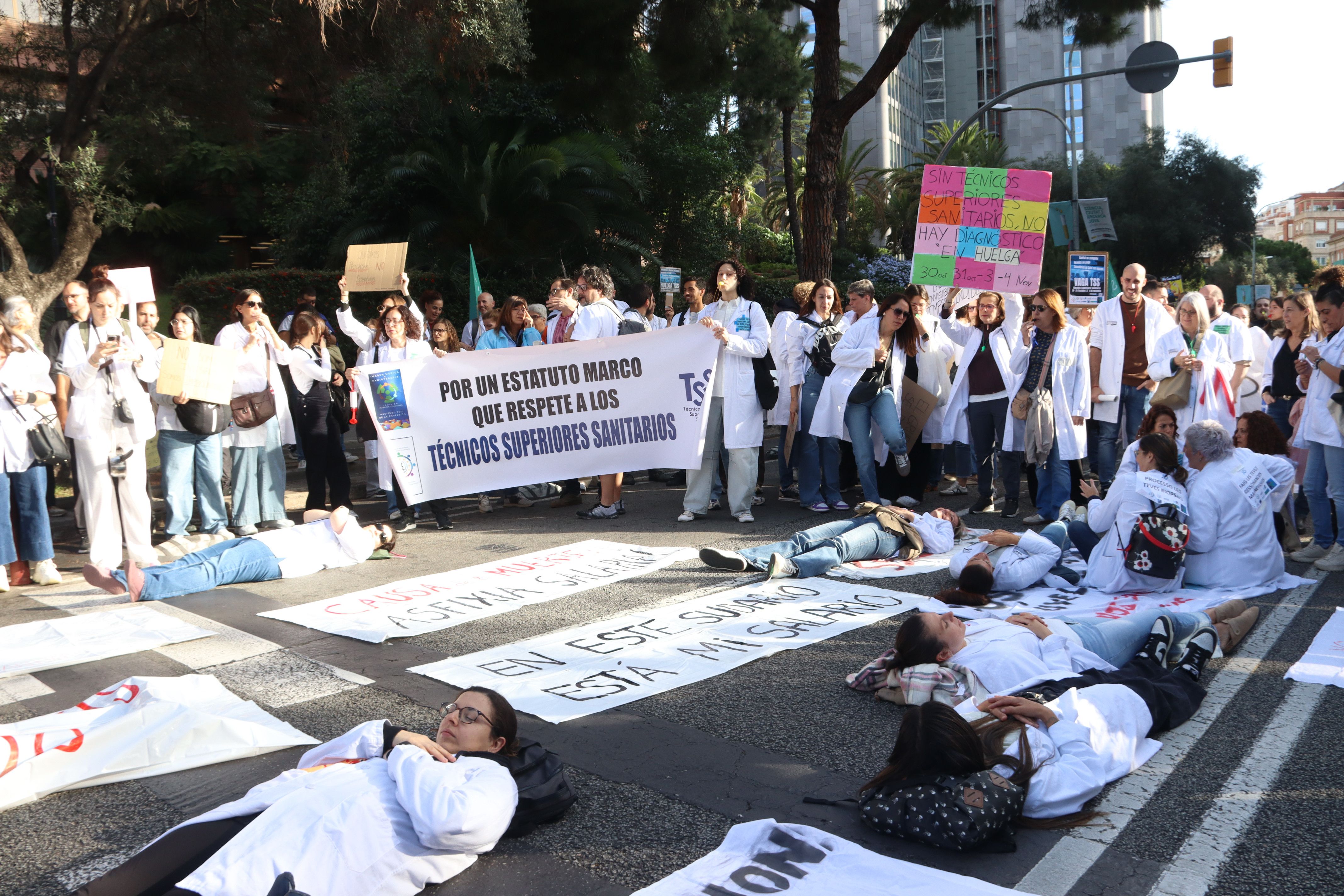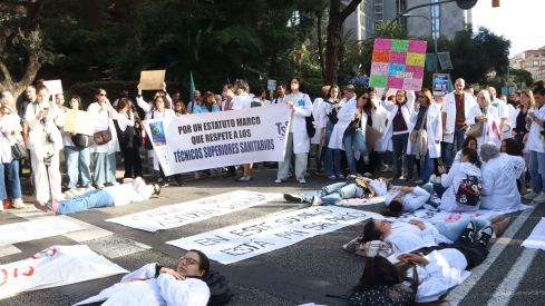 Cerca de 300 técnicos superiores sanitarios se manifiestan este viernes por la mañana en Barcelona con motivo de la segunda jornada de huelga estatal por sus condiciones laborales y formativas. Los técnicos denuncian que, a pesar de estar catalogados como grupo B desde 2007, no perciben la retribución que correspondería a esta categoría. Por otro lado, quieren que se equipare su formación a la del resto de Europa. La secretaria del sindicato SIETeSS en Cataluña, Montserrat Martín, ha reivindicado el peso de estos profesionales en la sanidad: "Sin nosotros no hay diagnóstico". La protesta ha empezado a las 9.30 horas en la Via Augusta, delante de unas oficinas de la Agencia Tributaria, y prevén llegar a la delegación del gobierno español.