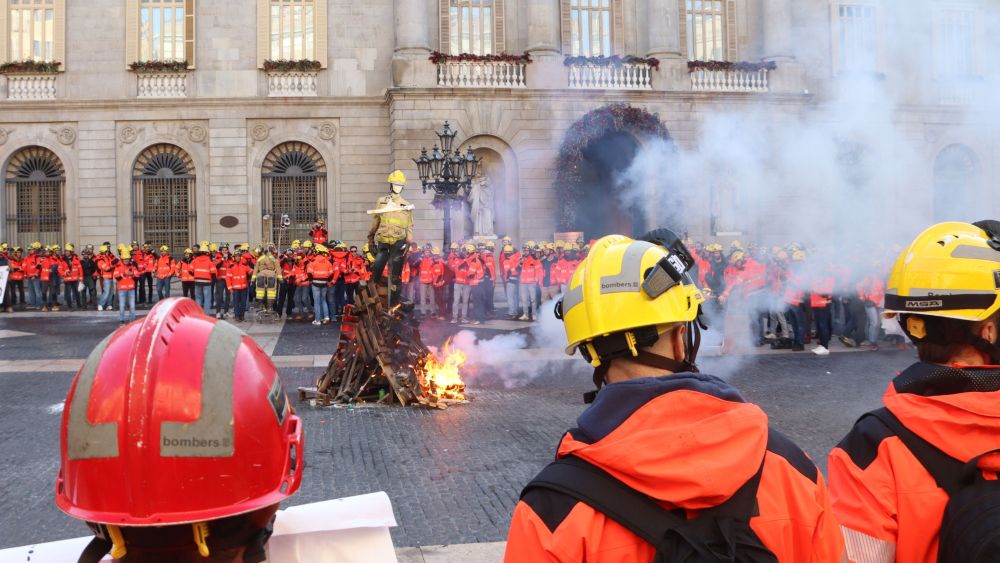 Una pira de palets con un muñeco que representaba a un bombero ha ardido en el centro de la plaza de Sant Jaume, frente al Palau de la Generalitat, como protesta por las condiciones en las que trabajan desde hace años los miembros de este cuerpo. Un humo denso y negro ha tomado la plaza durante unos pocos minutos entre el ruido de sirenas, silbatos y los muchos petardos que caracterizan especialmente las protestas de bomberos.