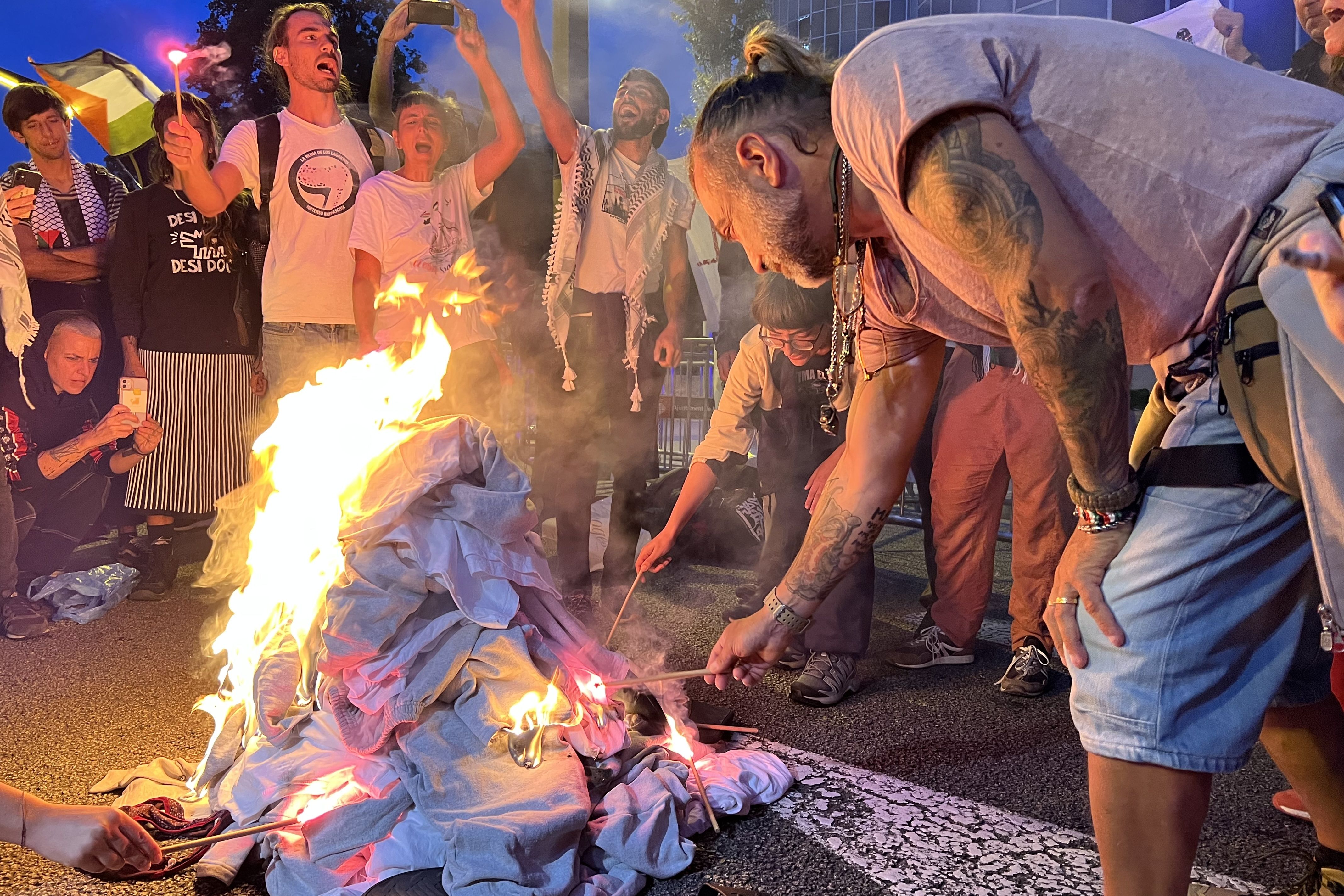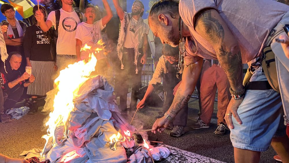 Activistas de la Global Sumud Flotilla han quemado este lunes por la tarde delante del Consulado de Israel en Barcelona los uniformes con los que pasaron entre cuatro días y más de una semana en la prisión israelí de Ketziot. Unas 200 personas han participado en la protesta, que ha cortado la Gran Via de Carles III. Algunos de los participantes han bajado desde la avenida Maria Cristina por la acera del lado derecho y otros, con una pancarta con el lema '15-O huelga general', lo han hecho por la izquierda. Los dos grupos se han concentrado delante del edificio y han hecho una pila de ropa, que después han encendido con bengalas y gasolina. También han llamado al paro del miércoles ante un acuerdo de paz entre Israel y Hamás "que no hay por dónde cogerlo".