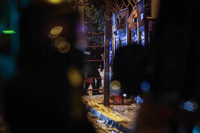 Trabajan con una radial y también se oyen golpes de martillo. Algunos agentes intentan entrar protegidos por los escudos, ya que desde arriba les cae escombro. Hay algún ocupa colgado en la fachada de una de las casas. Mientras tanto, los manifestantes han lanzado objetos contra periodistas y han causado daños en una inmobiliaria.