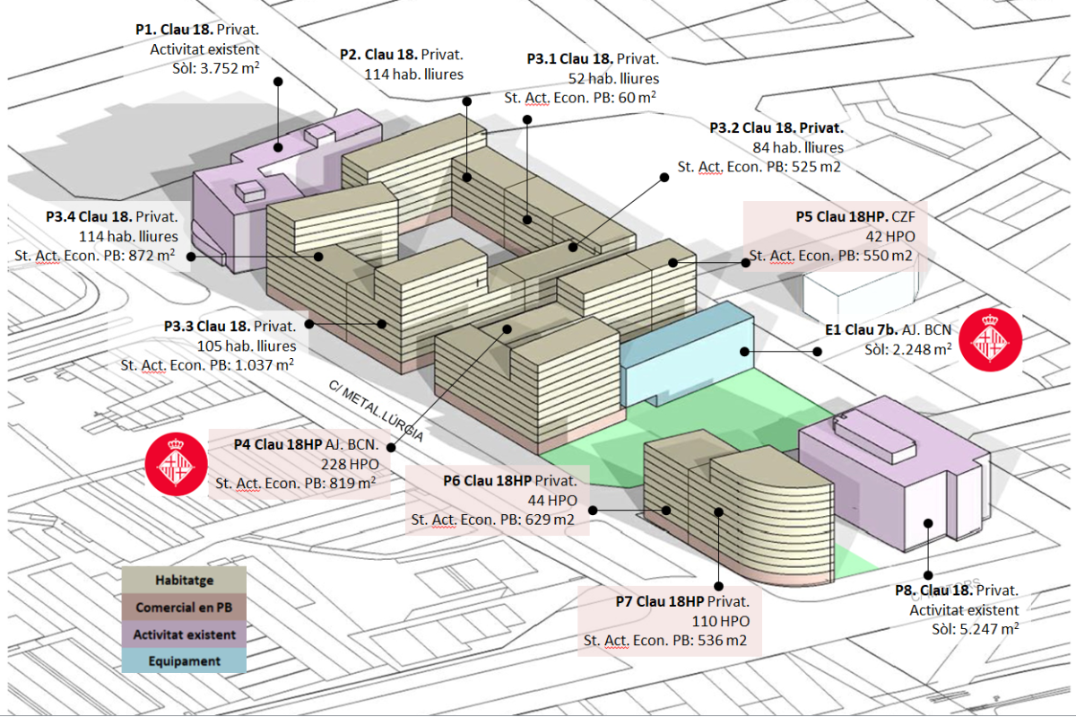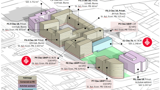 Así, el área se divide en una manzana superior, situada en la calle del Plom; una manzana central, y una manzana inferior ubicada en la calle Motors. La manzana de mayor superficie es la superior, integrada por un edificio de actividad económica, acogerá las promociones de vivienda libre. La manzana central se configurará en conjunto con el equipamiento municipal y un área verde y será donde se levantarán las 270 viviendas de protección oficial. Por último, la manzana inferior está integrada por el segundo edificio de actividad económica del sector y acogerá nuevas edificaciones residenciales con 154 viviendas protegidas de precio concertado de iniciativa privada.