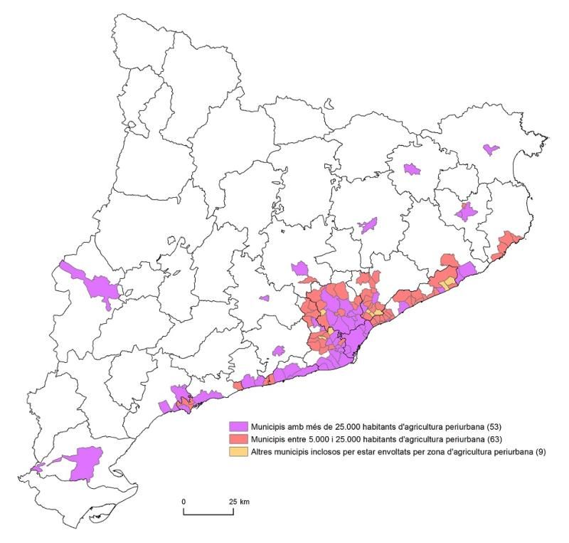 El resultado del estudio, es una propuesta de delimitación de 125 municipios que conforman el espacio de agricultura periurbana en Cataluña, que en consonancia con el modelo de poblamiento actual del territorio, se concentran básicamente en el área metropolitana de Barcelona, estableciendo un contínuum espacial que abarca buena parte de la franja costera, apunta Mòdol. De estos 125, 53 tienen más de 25.000 habitantes, 39 están en la demarcación de Barcelona, 7 en la de Tarragona, 6 en la de Girona y 1 en la de Lleida.