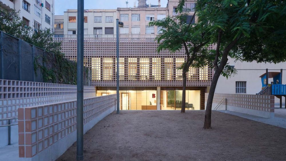 El porche de entrada tiene un umbráculo con voladizo en el exterior y la cubierta se convierte en una fachada más con un acabado vegetal respetando las visuales de las edificaciones del entorno. El resto de fachadas se han terminado con una celosía cerámica como una forma de remitir a la tradición constructiva catalana y mediterránea. Este acabado cerámico se encuentra también en los tres patios interiores que distribuyen el espacio y permiten la ventilación cruzada y el soleamiento homogéneo en todos los espacios, creando ambientes cálidos y acogedores.
