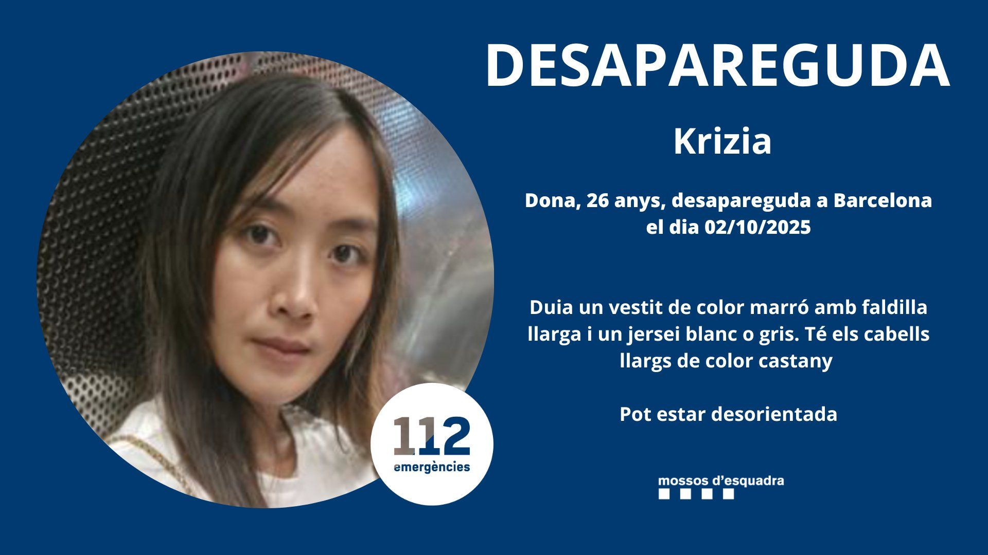 Los Mossos d'Esquadra han compartido a través de sus redes sociales una alerta para encontrar a Krizia, una joven de 26 años que se encontraría en paradero desconocido. La policía catalana ha hecho un llamamiento en las redes sociales para intentar encontrar a la mujer que ha desaparecido durante la jornada de hoy, activando todas las alarmas en el cuerpo de emergencias.