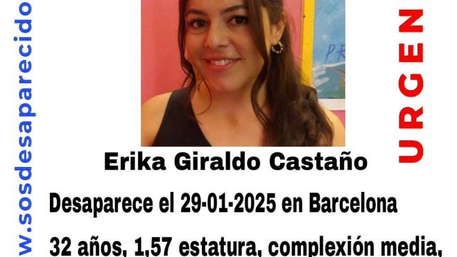 La asociación SOS Desaparecidos ha activado una alerta para solicitar la colaboración ciudadana en la búsqueda de Erika Giraldo Castaño, una mujer de 32 años que desapareció el 29 de enero de 2025 en Barcelona.