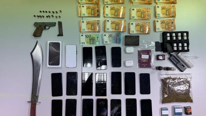En el interior del piso, los agentes confiscaron un total de 19 teléfonos móviles sustraídos, junto con un machete, una pistola y sustancias estupefacientes que sumaban 65 gramos de marihuana y 47 gramos de hachís. Además, se encontraron reactivos químicos relacionados con el análisis o manipulación de oro, un detector de diamantes y más de 23.000 euros en efectivo.