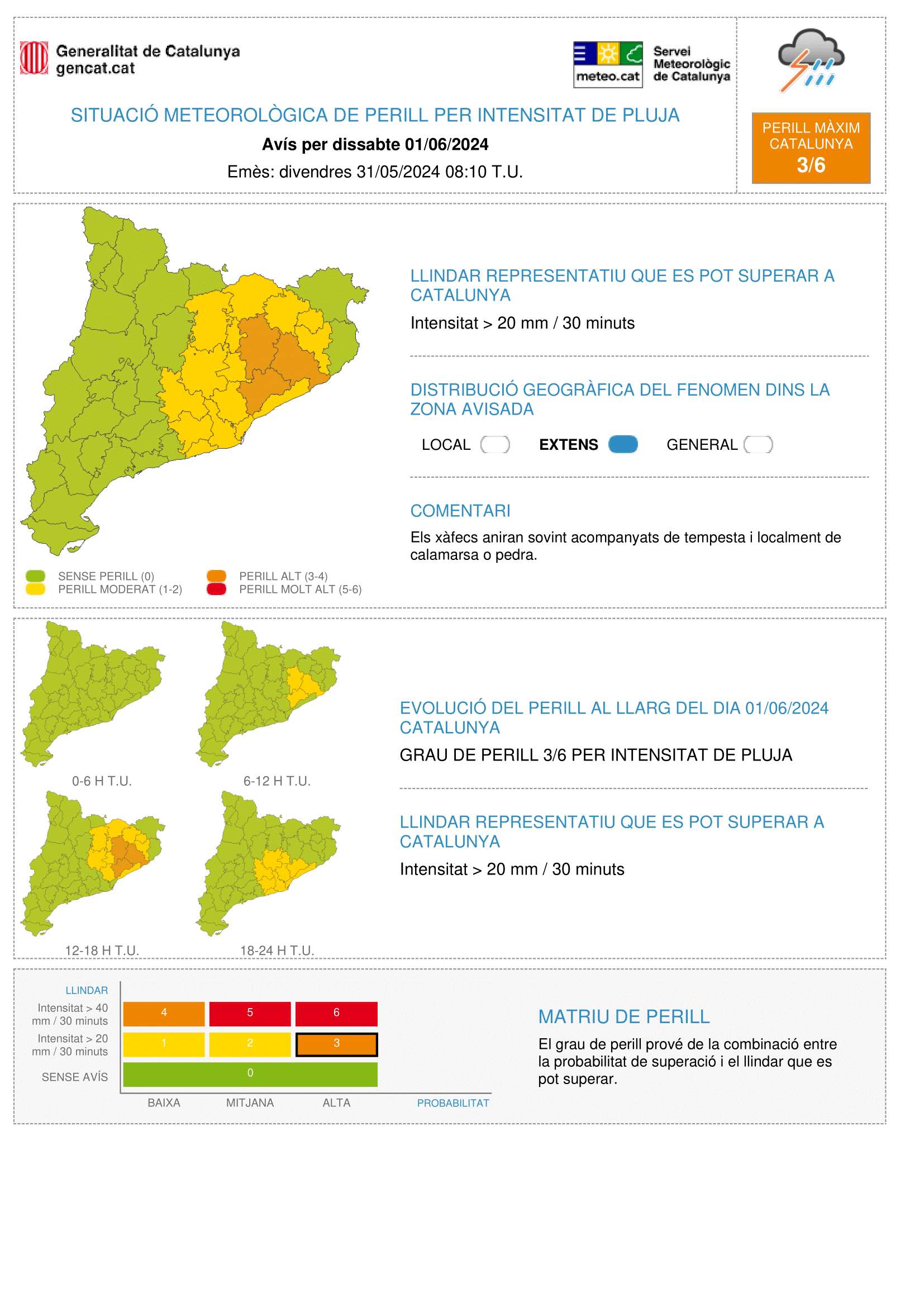 De cara a la tarde, a partir de las 18:00 h, los chubascos más intensos se pueden mantener en algunas de estas zonas y afectar también a El Barcelonès, El Maresme, El Baix Llobregat, L'Anoia, L'Alt Penedès y El Garraf. De nuevo, los chubascos pueden acumular 20 l/m² en media hora e ir acompañados de tormentas, granizo o granizo.