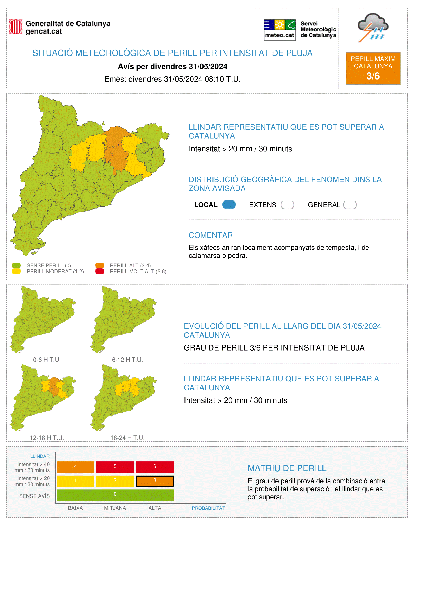 De cara a este viernes, la situación es muy similar a la del jueves por la tarde, fruto de la inestabilidad propia de la primavera. A partir de las 12:00 h, el Meteocat ha emitido alertas naranjas en las comarcas de Osona, El Ripollès y El Lluçanès, donde durante la tarde del jueves ya hubo patagos de agua que llegaron a acumular cerca de 50 litros en varias estaciones.