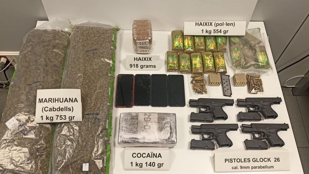 Dentro del inmueble, los agentes localizan y confiscan cuatro armas de fuego cortas, clasificadas como dispositivos de nueva generación, que el detenido ha intentado ocultar lanzándolas desde el piso. Además, decomisan más de un kilogramo de cocaína, aproximadamente 2,5 kilogramos de hachís y casi 2 kilogramos de marihuana.