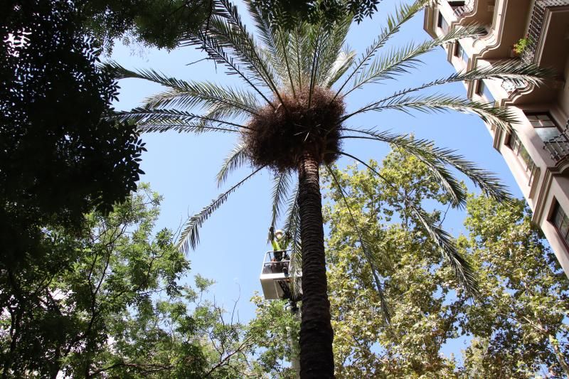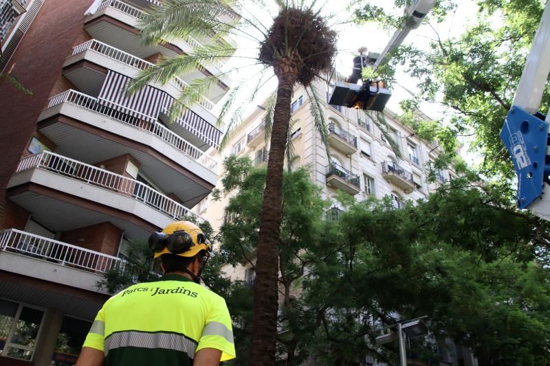 Por eso, como medida a corto plazo se ha optado por regar todas las palmeras datileras de características similares a la caída. Desde que se fracturó la palmera de la plaza de Emili Vendrell el jueves pasado, los técnicos de Parques y Jardines ya han revisado un centenar de palmeras datileras, de las cuales se han cortado preventivamente ocho.