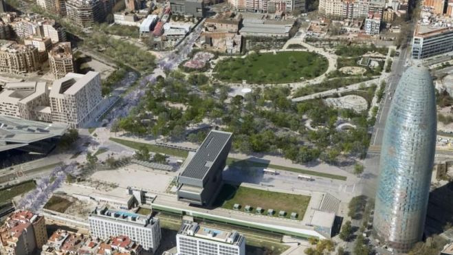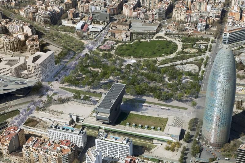 La plaza de las Glòries de Barcelona tendrá un jardín inmersivo que dará acceso a la estación de metro L1 y un área de juegos infantiles con una superficie de 1.968 metros cuadrados una vez se termine la transformación, que actualmente aún está en el tramo final.