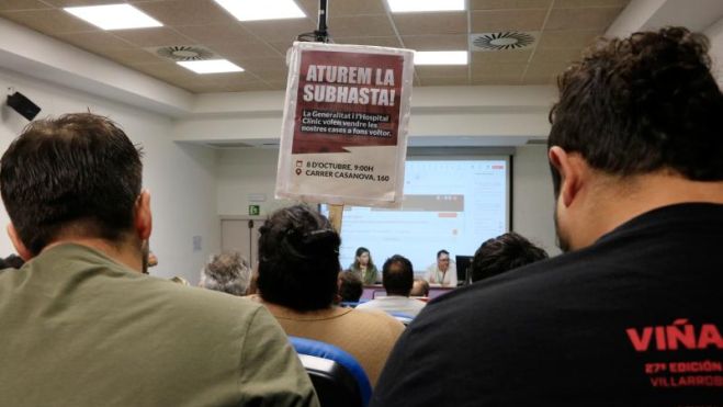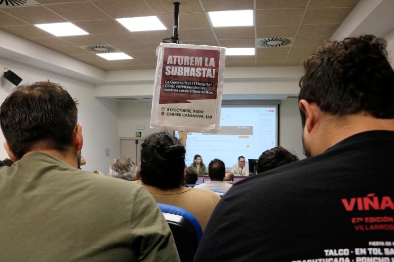 La subasta de cinco fincas propiedad del Hospital Clínico este martes ha tenido lugar ante la expectación y enfado de los vecinos afectados y activistas del Sindicato de Inquilinos. Unas decenas de personas se han concentrado desde primera hora a las puertas de las dependencias del hospital donde tenía que hacerse la subasta y después han llenado la sala para escuchar las ofertas.