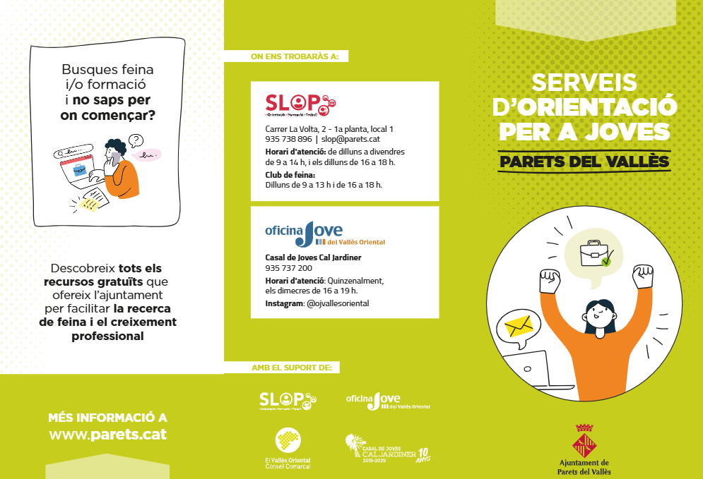 Por un lado, el Servicio Local de Empleo ofrece asesoramiento en el ámbito laboral o formativo. Los profesionales proponen consejos para elaborar su currículum, preparan las entrevistas laborales y administran a sus usuarios diferentes canales para buscar trabajo. A su vez, también organizan diferentes cursos y talleres para mejorar las competencias profesionales y aumentar las oportunidades laborales. El SLOP cuenta con el Club de Empleo, un espacio dedicado a la investigación activa con recursos y apoyo técnico, y una bolsa de trabajo, que gestiona ofertas de trabajo de empresas de Parets y de la comarca.