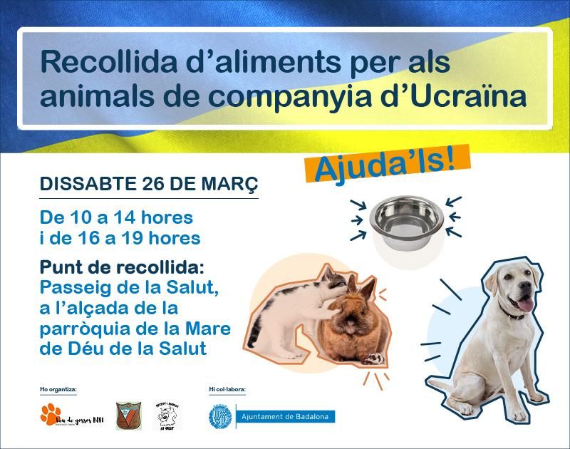 El próximo sábado 26 de marzo el paseo de La Salut de Badalona acogerá un acto solidario de recogida de alimentos para los animales de compañía de Ucrania. Estaba previsto que la recogida se hiciera el pasado sábado, pero finalmente se aplazó por las condiciones meteorológicas. Esta acción está organizada por la Asociación canina Veu de gossos BDN, la Asociación de Vecinos Juan Valera y la colla Bèsties i diables de La Salut con la colaboración del Área de Bienestar Animal del Ayuntamiento de Badalona.