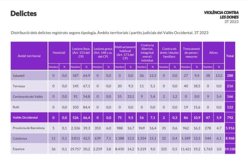 La mayoría de las mujeres acuden a los juzgados después de recibir lesiones leves, seguido de casi un 11% que deciden interponer una denuncia por ruptura de penas y medidas. Dentro del Vallès, Terrassa destaca por una elevada proporción de ruptura de penas (18,5%). Seguidamente, se encuentran los delitos de maltrato habitual, en el que la víctima ha recibido maltrato físico o psíquico repetidamente. Cabe destacar que el partido judicial de Cerdanyola tiene más de un 30% de delitos registrados por esta tipología. Finalmente, el otro grueso importante de denuncias son por delitos contra la libertad, la integridad moral, la intimidad y el honor.