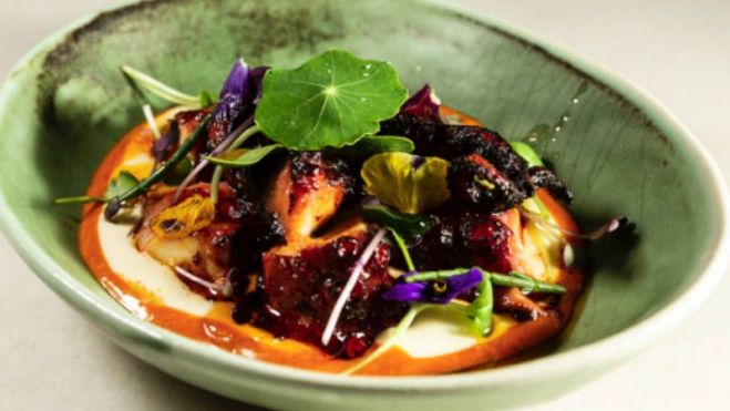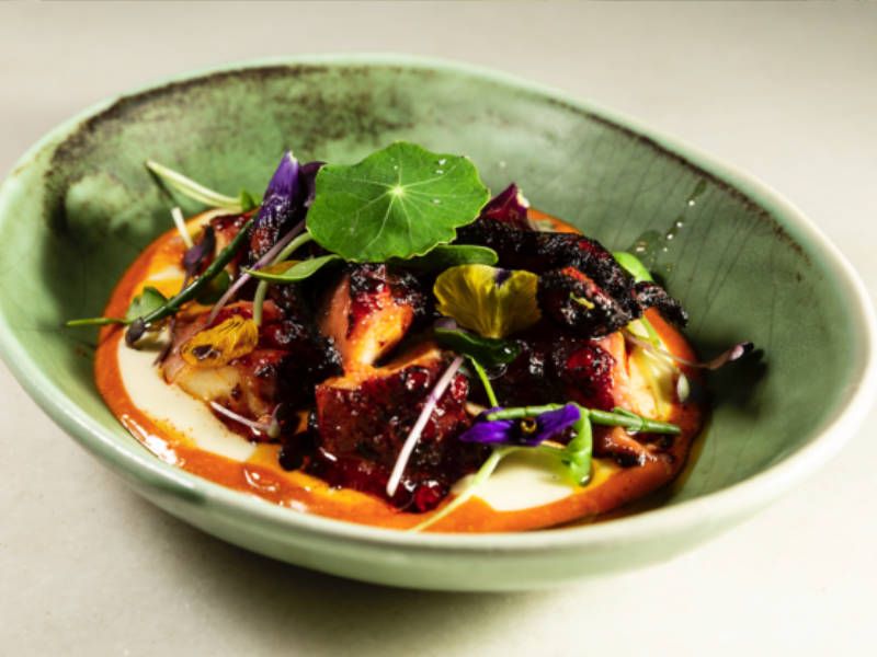 La experiencia gastronómica comienza con entrantes que ya dejan huella: la lámina de careta de cerdo, crujiente e intensa; la vichyssoise de puerro y almendra, suave y equilibrada; la tostada de calamar y panceta, llena de sabor; y el crujiente de cerdo con gamba, un bocado meloso que sorprende.