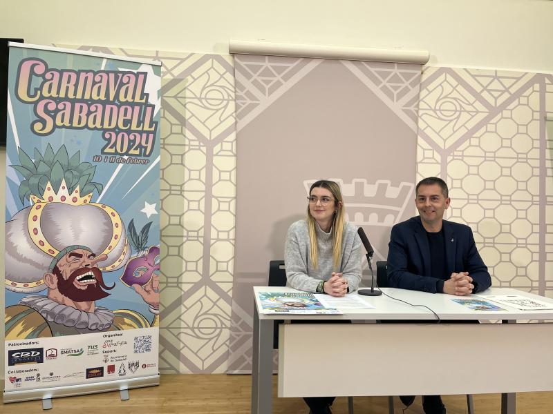 El concejal de Cultura, Carles de la Rosa, junto con Judit Peidro, miembro del Grupo Disbauxa de Carnaval -la entidad local organizadora- han presentado hoy el cartel y el programa de actividades del Carnaval de Sabadell 2024.