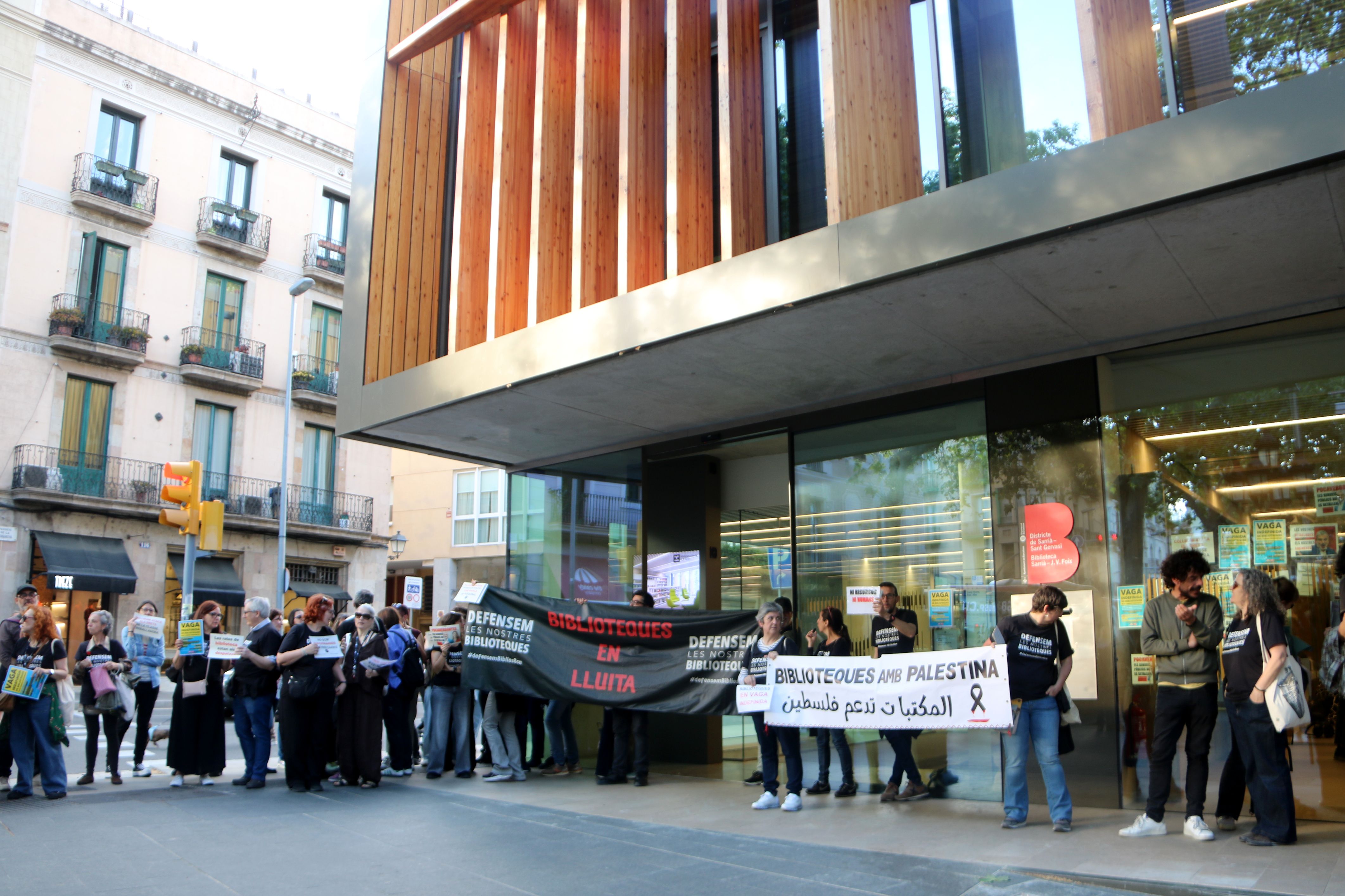 La Biblioteca Sarrià – J.V. Foix ha sido el escenario inicial este lunes por la tarde de una huelga parcial convocada por los trabajadores del Consorci de Biblioteques de Barcelona, que se ha traducido en la desocupación de los usuarios entre las 18:00 y las 21:00 horas. En diferentes puntos interiores del centro, se expusieron carteles informativos mientras algunos empleados lucían camisetas con mensajes reivindicativos. En el exterior, decenas de personas se concentraron para apoyar esta primera acción de un calendario más amplio previsto para los próximos días.