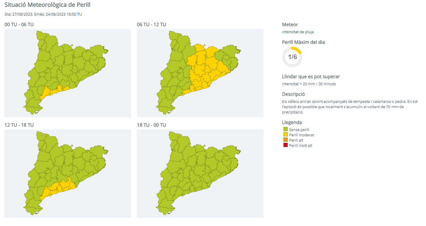 Toda la costa, desde el Baix Camp hasta la Selva, estará en aviso amarillo por peligro de intensidad de lluvias con acumulaciones que pueden ser de 20 mm en 30 minutos. También el interior de Barcelona, la Cataluña Central y la parte central de los Pirineos se encuentra en esta situación.