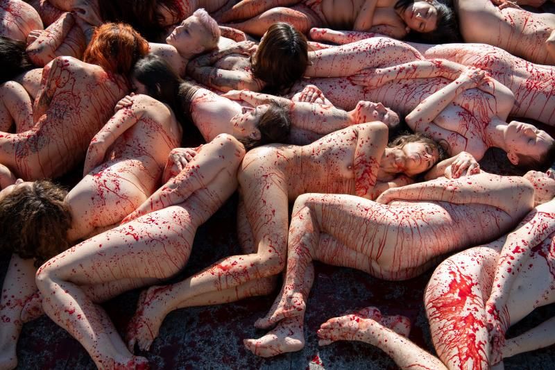 Medio centenar de activistas animalistas, desnudos y rociados con sangre artificial, han participado este domingo en la plaza Cataluña de Barcelona en un acto organizado por la asociación Anima Naturalis para exigir a la Comisión Europea el cierre de las granjas peleteras.