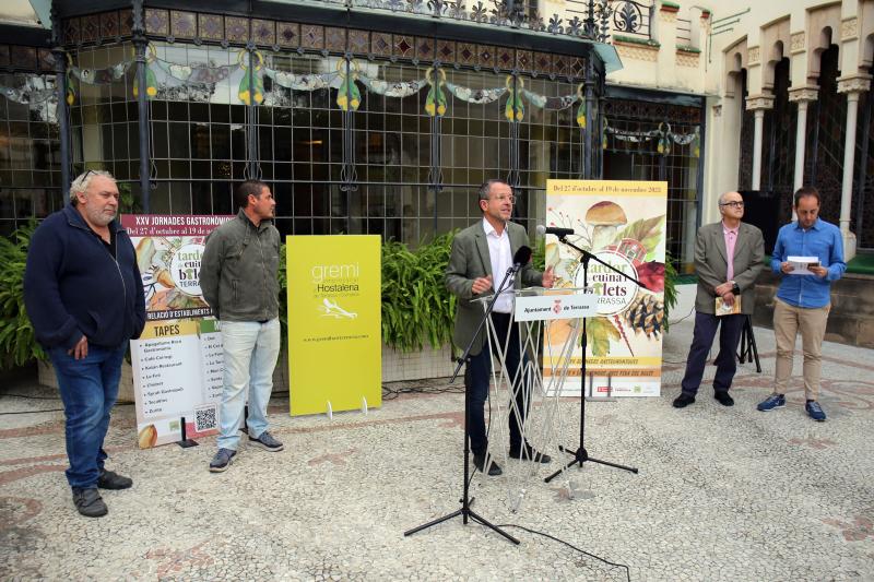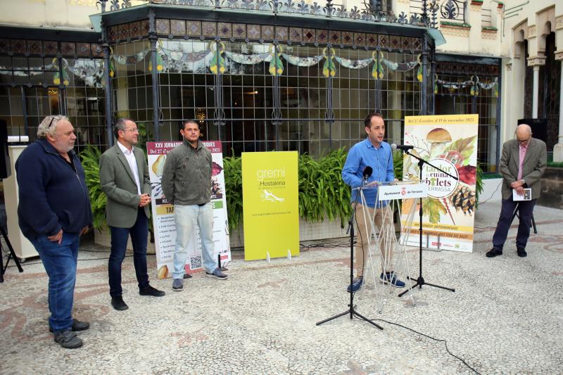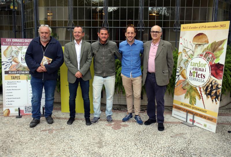 El teniente de alcalde y concejal de Comercio de Terrassa, Xavier Cardona; y el concejal de Turismo, Pep Forn; acompañados del presidente del Gremio Empresarial de Hostelería de Terrassa y Comarca, Xavier Gómez; del miembro del Gremio Empresarial de Hostelería de Terrassa y Comarca y representante de la Cata de Vinos Rambla Nord organizada por Tecavins, Cesc Castellet; y del presidente de la Asociación de Paradistas del Mercado de Sant Pere, Ignasi Torres; han participado esta tarde en la presentación de la campaña Otoño de Cocina y Setas en Terrassa 2023. El acto ha tenido lugar en el patio de la Casa Alegre de Sagrera.