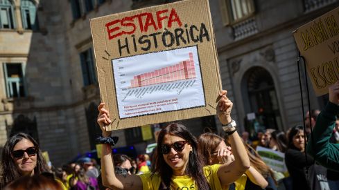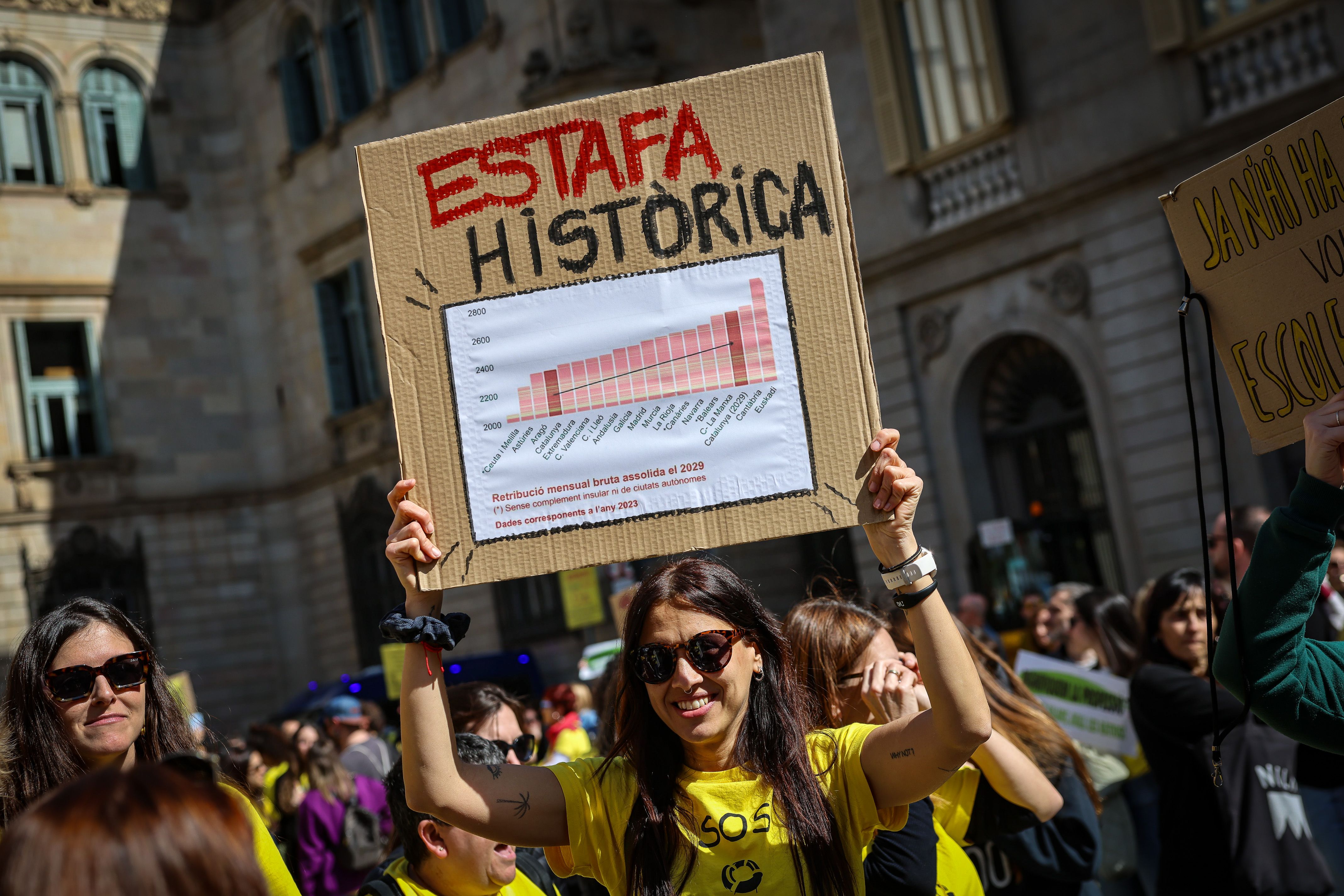 Los docentes han protestado contra el acuerdo entre Educación, CCOO y UGT, que consideran insuficiente, y han acusado a estos dos sindicatos de ser “del PSC”. Durante la movilización también han cargado contra el presidente del Gobierno, Salvador Illa; la consejera de Enseñanza, Esther Niubó; y el consejero de la Presidencia, Albert Dalmau.