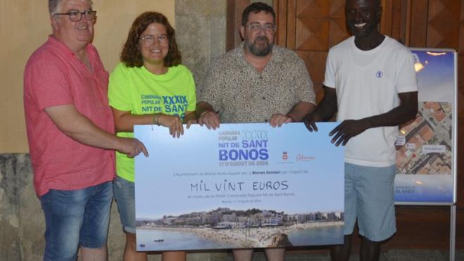 Antes de comenzar la caminata, el alcalde de Blanes, Jordi Hernández, acompañado de la concejala de Deportes, Mònica Rabassa, y otros concejales del consistorio, entregaron un simbólico talón valorado en un total de 1.020 euros.Son la suma de las aportaciones realizadas hasta ese momento, pendiente del cierre de inscripciones.En nombre de Blanes Solidari recogió el talón Assane Ndiaye, vocal de la entidad, acompañado de buena parte de sus miembros.