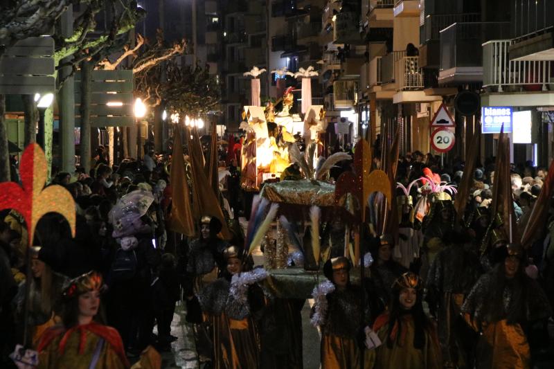 Cientos de niños y familias expectantes han esperado este viernes por la tarde la llegada de Sus Majestades a Blanes. Lo han hecho primero en la biblioteca comarcal, desde donde se ha ofrecido un espectáculo pirotécnico y, después, repartidos por las calles de la localidad. Este año, la cabalgata blanenca ha estrenado y renovado las carrozas de la rúa, que se ha alargado cerca de dos horas y que ha ido precedida en todo momento por los músicos de la Banda y Cobla del Col·legi Santa Maria y la Banda Musical de Blanes y Mossèn Joan Batlle.